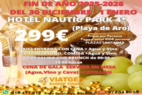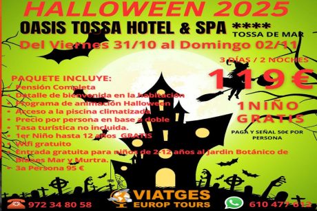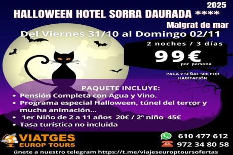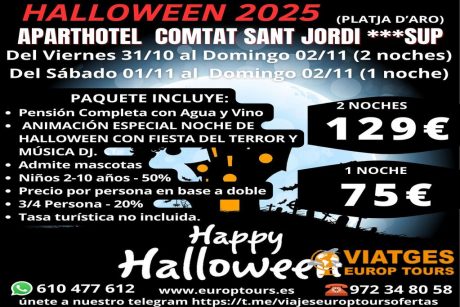 Otros productos HALLOWEEN EN TOSSA DE MAR 2025 De 119 € a 119 € 3 días Por su cuenta Completo HALLOWEEN EN MALGRAT DE MAR 2025 De 99 € a 99 € 3 días Por su cuenta HALLOWEEN EN PLAYA DE ARO 2025 De 129 € a 129 € 3 días Por su cuenta FIN DE AÑO 2025-2026 PLAYA DE ARO De 299 € a 299 € 3 días Por su cuenta PRENADAL SALOU 2025 De 149 € a 149 € 3 días Por su cuenta NAVIDAD EN PORT AVENTURA 2025 De 149 € a 149 € 3 días Por su cuenta HALLOWEEN EN SALOU 129 € 3 días Por su cuenta